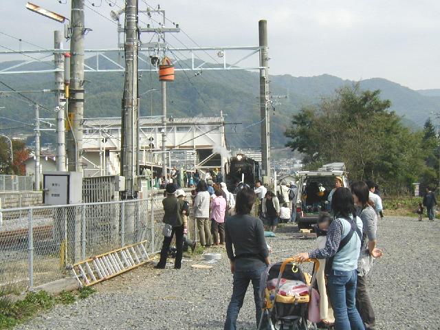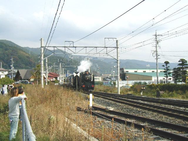 中央東線(富士見−岡谷間)開業100周年記念運転 ![]() 下諏訪駅横 大勢の人が見物に来ていました 蒸機列車は40年ぶり 停車中も汽笛を何回も鳴らして大サービスです ![]() 試9531レ 乗務員もにこやかに手を振って行きました ![]() 12系客車の後 しんがりはEF64 42 ![]() 約30分後 試9532レ 今度はD51が最後尾 反射板をつけてやって来ました ![]() 単線区間で上り下りひっきりなしに列車がやってきます その合間を縫っての運転なので 停車時間が長くなります ![]() 下り貨物が通過した後やっと発車 小さな子供たちも恐々見入っていました ![]() その後すぐに迎えのカマがやって来ました 帰りはこれが先頭で電蒸三重連になります メインページへ戻る |